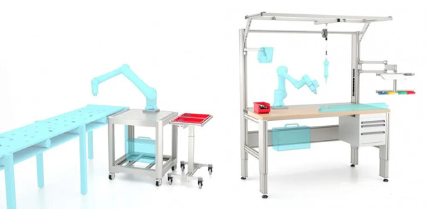如果是用機(jī)器人開展協(xié)作任務(wù),安裝了協(xié)作型機(jī)器人的協(xié)作型工作臺(tái)(下圖右側(cè))則更加適合。工作臺(tái)后部是帶 8 系列槽軌的型材,可以牢固地安裝機(jī)器人或協(xié)作型機(jī)器人。