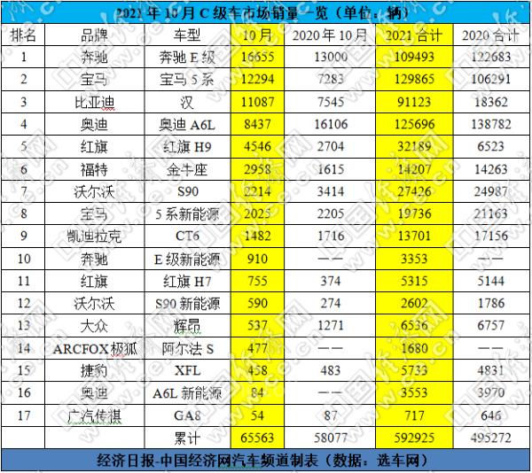 其中,以奧迪、奔馳、寶馬(ABB)為代表的高檔車品牌,基本“收回”了在該細(xì)分市場(chǎng)的領(lǐng)先優(yōu)勢(shì)。數(shù)據(jù)顯示,奔馳E級(jí)、寶馬5系和奧迪A6L等3款產(chǎn)品(含新能源車型),在10月的累計(jì)銷量達(dá)32855輛,占該細(xì)分市場(chǎng)份額的64.63%;前10個(gè)月銷量合計(jì)為391696輛,占比66.06%。
