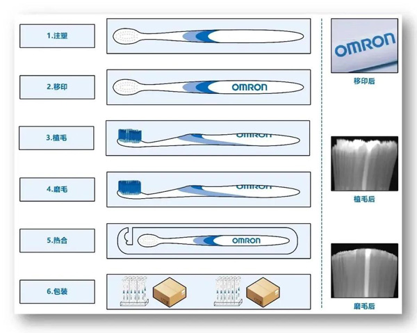 牙刷的生產(chǎn)工序分為注塑、移印、植毛、磨毛、熱合、整包、裝盒等,目前國內(nèi)的生產(chǎn)設(shè)備多為手動、半自動設(shè)備,各工序間的銜接工作主要由人工進(jìn)行。為了提升效率、縮減人工成本,需要實(shí)現(xiàn)從注塑段到末段裝盒,整個(gè)生產(chǎn)的自動化。