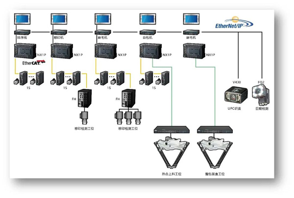各設(shè)備、工序間通過EtherNet/IP、EtherCAT等網(wǎng)絡(luò)進(jìn)行生產(chǎn)數(shù)據(jù)快速穩(wěn)定地的交換管理,不僅減少了客戶的硬件成本,也實(shí)現(xiàn)了各設(shè)備、工序間的高同步性。