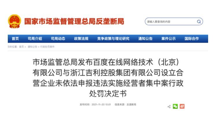 百度在線網(wǎng)絡(luò)技術(shù)(北京)有限公司與浙江吉利控股集團(tuán)有限公司設(shè)立合營企業(yè)違反反壟斷法,分別被罰50萬元。文件顯示,2021年1月10日,百度在線與吉利簽署《百度在線網(wǎng)絡(luò)技術(shù)(北京)有限公司及浙江吉利控股集團(tuán)有限公司關(guān)于設(shè)立新能源汽車領(lǐng)域合資公司之合資經(jīng)營合同》,設(shè)立合營企業(yè),百度在線與吉利分別持股55%和45%。根據(jù)上述協(xié)議,合營企業(yè)由雙方共同控制。2021年3月2日,合營企業(yè)取得營業(yè)執(zhí)照。