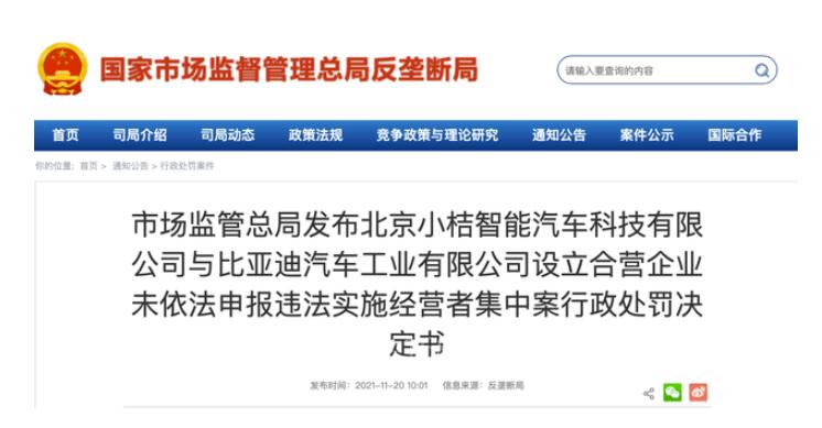 北京小桔智能汽車科技有限公司與比亞迪汽車工業(yè)有限公司設(shè)立合營企業(yè)案違反反壟斷法,分別被罰50萬元。文件顯示,2019年7月10日,小桔智能與比亞迪簽署《合資經(jīng)營合同》設(shè)立合營企業(yè),滴滴持股35%,比亞迪持股65%。2019年11月1日,合營企業(yè)取得營業(yè)執(zhí)照。