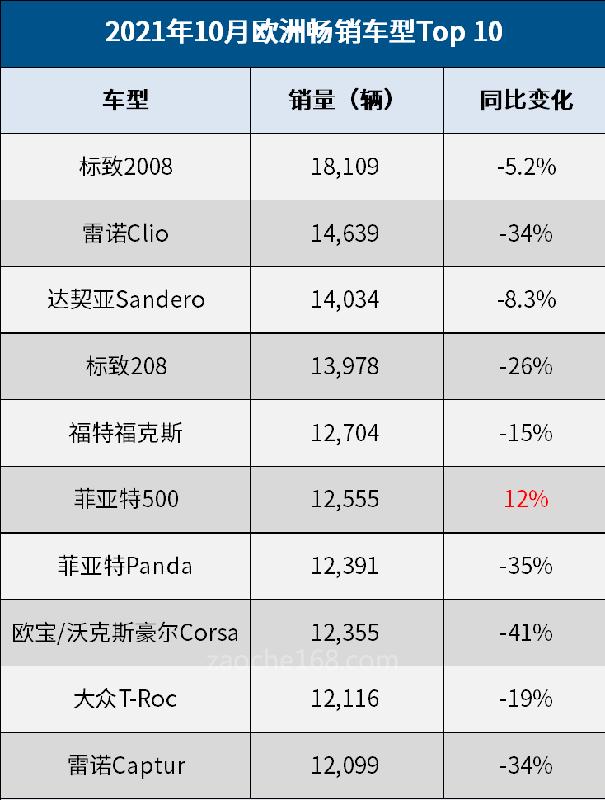 在10月歐洲最暢銷的十款車型中,只有菲亞特500的銷量較去年同期有所增長(zhǎng)。隨著純電動(dòng)車型菲亞特新500 (New 500)的推出,菲亞特500今年在歐洲銷量有所提高。10月,菲亞特500的銷量為12,555輛,同比增長(zhǎng)12%,排在第六位。