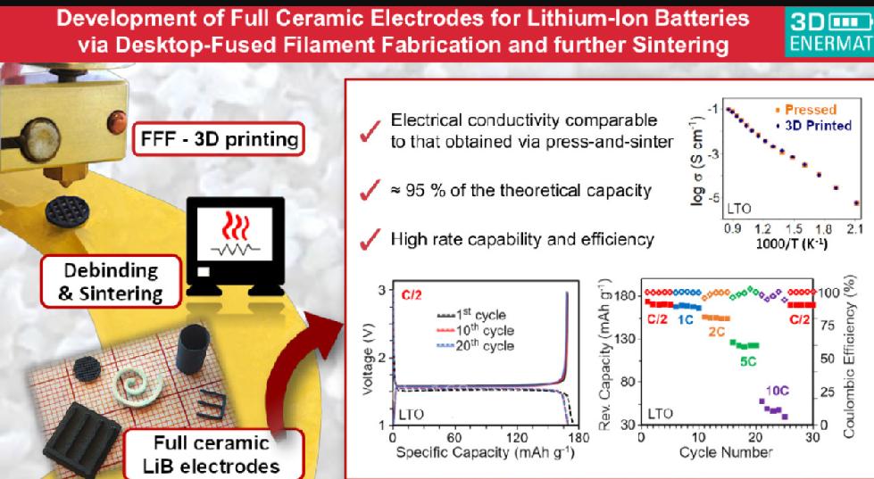 與傳統(tǒng)的生產(chǎn)工藝相比,3D打印的功率設(shè)備及其元件,在這一領(lǐng)域具有明顯的優(yōu)勢,可以開發(fā)具有高表面積的電極,或制造具有適合特定產(chǎn)品設(shè)計的幾何形狀設(shè)備,并優(yōu)化工藝中活性材料的數(shù)量。熔絲制造 (FFF) 是一種可行且低成本的鋰離子電池制造方法,在不同技術(shù)中可用于制造具有定制幾何結(jié)構(gòu)的鋰離子電池。比起需要使用有機粘結(jié)劑的標準復(fù)合電極,全陶瓷電極具有更高的能量密度,因此,將陶瓷FFF應(yīng)用于電極領(lǐng)域,可能是一項有價值的技術(shù)。