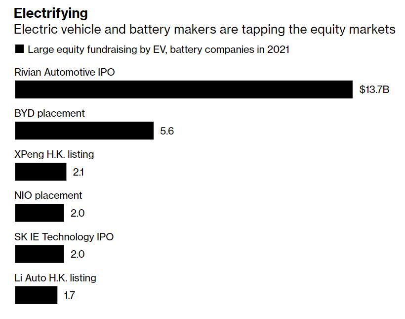 今年規(guī)模最大的IPO正是來(lái)自電動(dòng)汽車行業(yè)的Rivian。11月初,電動(dòng)皮卡制造商Rivian在美國(guó)上市,融資137億美元,目前股價(jià)較發(fā)行價(jià)已上漲47%。