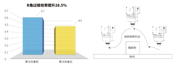 高速定位無超調(diào),自適應(yīng)靈敏度調(diào)節(jié);隨動響應(yīng)速度快,最高斜板(1:10 坡度)跟隨軌跡速度大于 40m/min;切管 R 角隨動算法優(yōu)化,提高過棱效率;高速蛙跳過程中,開啟蛙隨一體功能,智能規(guī)劃避障路線,保證安全。
