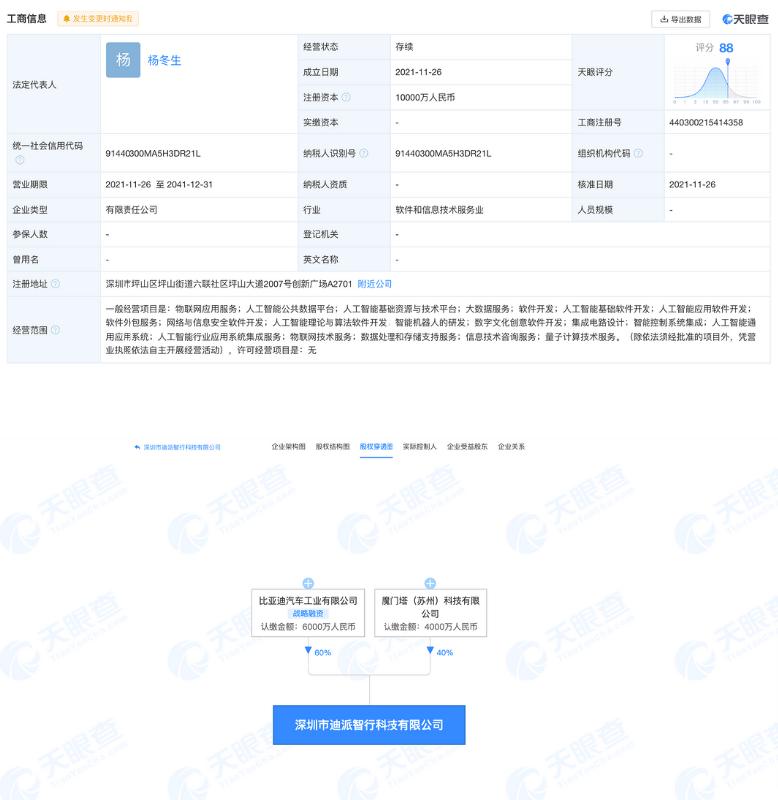 深圳市迪派智行科技有限公司成立于2021年11月26日,法定代表人為楊冬生,注冊(cè)資本為1億元。公司經(jīng)營(yíng)范圍包括物聯(lián)網(wǎng)應(yīng)用服務(wù)、人工智能公共數(shù)據(jù)平臺(tái)、人工智能基礎(chǔ)資源與技術(shù)平臺(tái)等。該公司由比亞迪汽車工業(yè)有限公司持股60%,魔門塔(蘇州)科技有限公司持股40%。