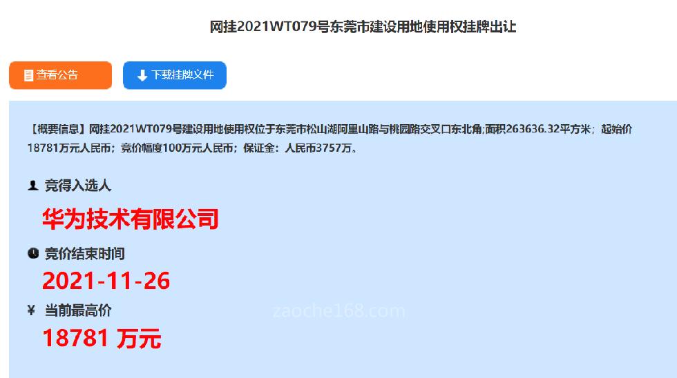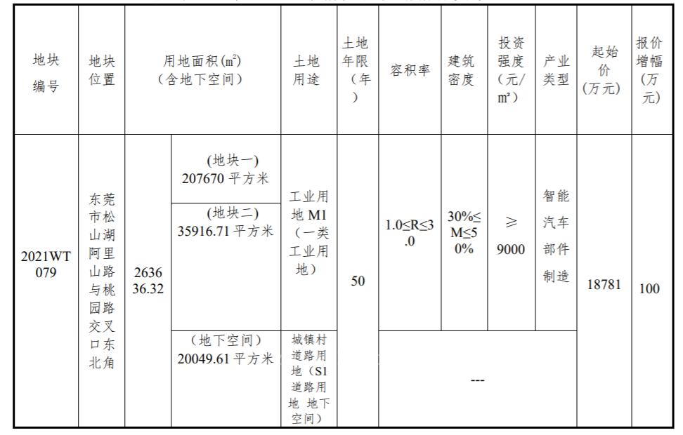 日前,有媒體報(bào)道稱(chēng),華為以1.88億元競(jìng)得東莞松山湖一宗產(chǎn)業(yè)用地,或與智能汽車(chē)項(xiàng)目有關(guān)。蓋世汽車(chē)通過(guò)東莞市公共資源交易網(wǎng)了解到,華為競(jìng)得的該地塊編號(hào)為2021WT079,面積為26.36萬(wàn)平方米,位于東莞市松山湖阿里山路與桃園路交叉口東北角, 產(chǎn)業(yè)類(lèi)型歸屬為“智能汽車(chē)部件制造”。同時(shí),東莞松山湖高新區(qū)項(xiàng)目投資效益協(xié)議合同書(shū)顯示,項(xiàng)目投資總額不低于24億元。