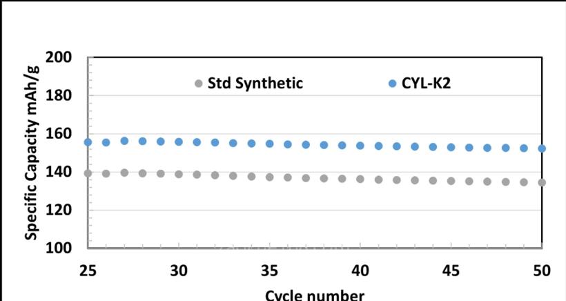 延長循環(huán)表現(xiàn)出可逆充/放電行為,經(jīng)過50次循環(huán)后,總?cè)萘繐p失小于10%。相比之下,經(jīng)過C/5穩(wěn)定循環(huán)(25-50次),性能最佳的脈狀石墨材料提供了155mAh/g的平均可逆容量,而標準合成石墨為139mAh/g。電池在全電芯系統(tǒng)中以C/5的速率進行測試,相當于5小時充電和5小時放電,每天大約可完成2個以上的完整循環(huán),即25到50次循環(huán)。