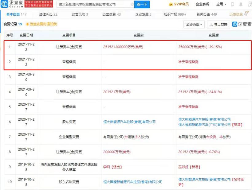 企查查日前公布的信息顯示,當(dāng)前恒大集團(tuán)不僅沒(méi)有收縮汽車業(yè)務(wù),反而是在增資汽車相關(guān)產(chǎn)業(yè)。最新的消息顯示,11月22日,恒大新能源汽車投資控股集團(tuán)有限公司發(fā)生了工商變更,公司注冊(cè)資本由25.15億美元增加至35億美元,增幅為39.15%。