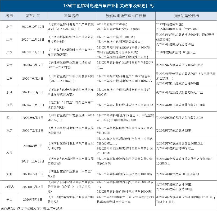 從上述13個(gè)省份制定的政策目標(biāo)可以看到,在“十四五”期間,氫燃料電池汽車的發(fā)展基本分為兩個(gè)階段,2023年前為示范應(yīng)用階段,此后到2025年則為加速發(fā)展階段。在各省份制定的具體推廣應(yīng)用目標(biāo)上,北京、上海、山東、河南、河北、內(nèi)蒙古均明確提出到2025年氫燃料電池汽車推廣目標(biāo)為萬輛,不過實(shí)際推廣結(jié)果如何,還有待時(shí)間和市場(chǎng)的檢驗(yàn)。