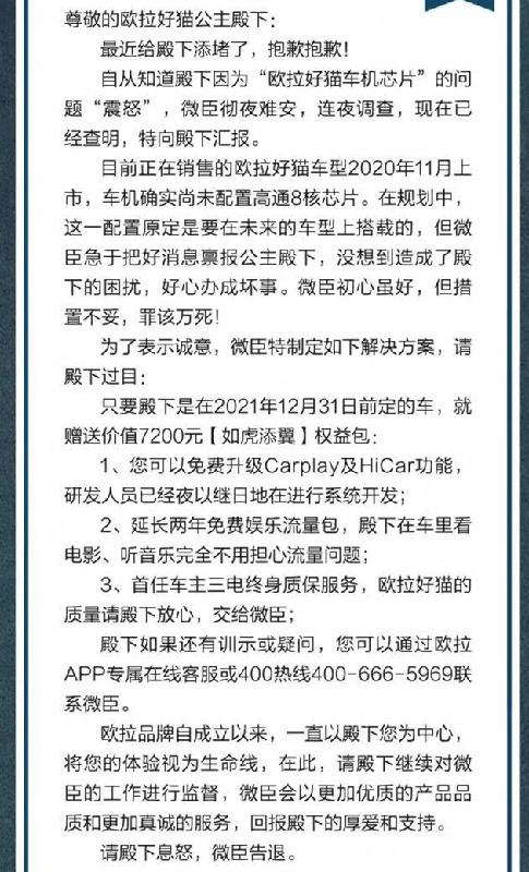 近日,歐拉好貓“芯片造假門”在網(wǎng)絡(luò)上傳得沸沸揚(yáng)揚(yáng)。事情的起因是歐拉好貓車主經(jīng)過(guò)測(cè)試發(fā)現(xiàn),好貓使用的是2016年發(fā)布的舊款英特爾四核A3940芯片,該芯片性能落后且兼容性差,與歐拉官方宣傳的“歐拉好貓采用高通八核芯片”完全不符。之后,歐拉官方通過(guò)歐拉APP發(fā)布聲明,稱已第一時(shí)間成立專項(xiàng)工作組開(kāi)展調(diào)查,同時(shí)稱有非歐拉用戶冒充真實(shí)用戶煽動(dòng)負(fù)面情緒,企圖謀取不正當(dāng)利益,歐拉已固定相關(guān)證據(jù)并報(bào)警。五天后,歐拉官方更新此聲明,表示目前歐拉正在銷售的歐拉好貓確實(shí)尚未配置高通八核芯片,宣傳中所標(biāo)注的高通八核芯片是準(zhǔn)備在未來(lái)車型中使用的,并給出了一系列補(bǔ)償服務(wù),以此安慰“震怒”的車主。