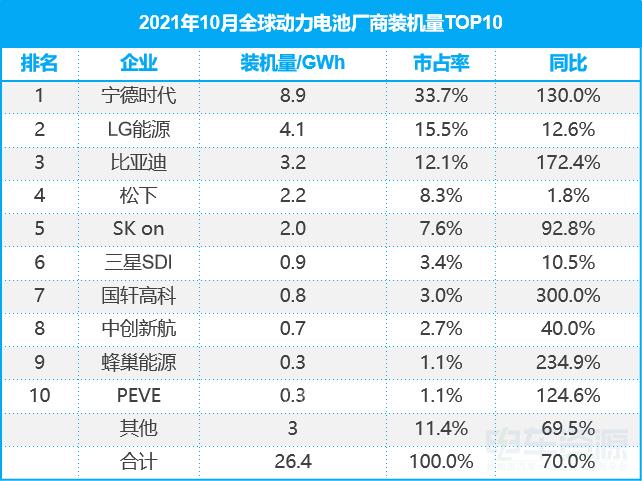 據(jù)數(shù)據(jù)顯示,2021年10月,全球動(dòng)力電池裝機(jī)量達(dá)到26.4GWh,同比增長(zhǎng)70%,中國(guó)本土企業(yè)均實(shí)現(xiàn)同比上漲。排名TOP10的企業(yè)分別是寧德時(shí)代、LG新能源、比亞迪、松下、SK on、三星SDI、國(guó)軒高科、中創(chuàng)新航(中航鋰電)、蜂巢能源和PEVE,10家企業(yè)合計(jì)市場(chǎng)份額達(dá)88.6%。