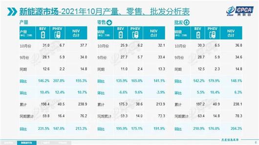 作為論據(jù),剛剛過去的10月,據(jù)乘聯(lián)會(huì)公布的成績顯示,新能源批發(fā)銷量達(dá)到36.8萬輛,環(huán)比增長6.3%,同比增長148.1%。1-10月新能源乘用車批發(fā)238.1萬輛,同比增長204.3%。