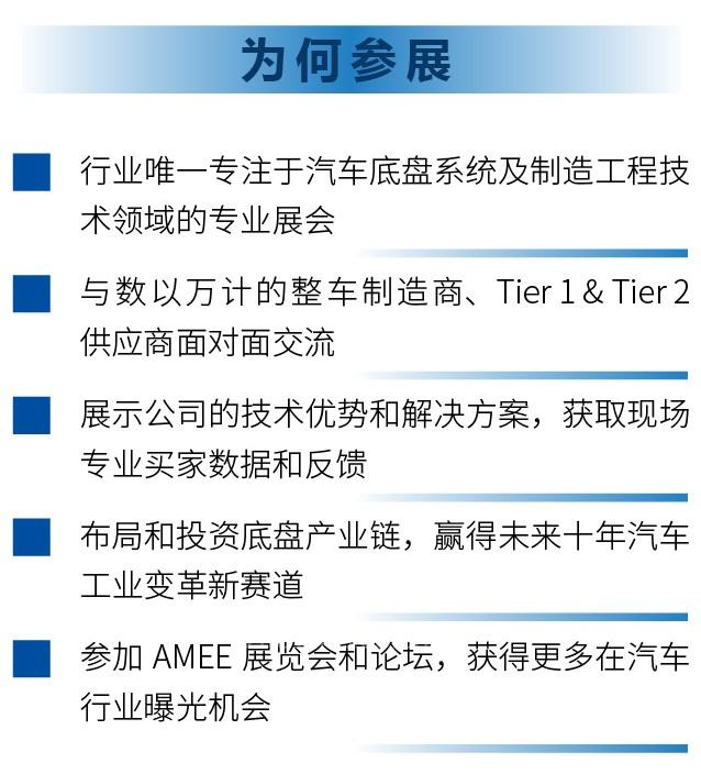 上海國際汽車底盤系統(tǒng)與制造工程技術(shù)展覽會(簡稱:AMEE)創(chuàng)辦于2018年,是全球汽車底盤工程技術(shù)領(lǐng)域的旗幟展覽會,AMEE為中國汽車底盤技術(shù)創(chuàng)新與持續(xù)發(fā)展搭建了高質(zhì)量平臺,促進(jìn)全球汽車制造商綜合競爭力的提升,AMEE已成為汽車底盤研發(fā)、技術(shù)、工藝、采購、質(zhì)量和管理人員每年必參加的重要活動之一。