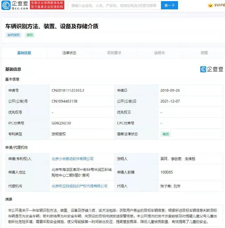 從企查查APP顯示,12月7日,北京小米移動(dòng)軟件有限公司“車輛識(shí)別方法、裝置、設(shè)備及存儲(chǔ)介質(zhì)”專利獲授權(quán)。