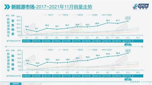 的確,隨著“雙碳”目標和節(jié)能減排觀念的逐漸普及,潛在消費者對新能源車的接受度不斷提高,使得今年國內新能源銷量節(jié)節(jié)攀升,11月新能源市場的生產、批發(fā)與零售量更是均再次創(chuàng)下新高,分別為43.5萬輛、42.9萬輛和37.8萬輛,其中前兩者是首次突破40萬輛。