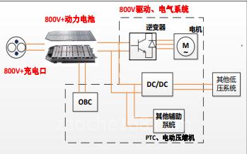 核心電動(dòng)化部件突破800V高壓化,配合大功率充電技術(shù)可實(shí)現(xiàn)極速充電,并率先在高性能純電動(dòng)乘用車上應(yīng)用。電動(dòng)汽車電氣架構(gòu)主要涉及動(dòng)力電池、高壓配電系統(tǒng)、電驅(qū)系統(tǒng)、電動(dòng)壓縮機(jī)總成、DCDC、OBC等。高壓電氣架構(gòu)無中間電壓轉(zhuǎn)化效率損失,驅(qū)動(dòng)系統(tǒng)采用寬禁帶半導(dǎo)體,提高驅(qū)動(dòng)系統(tǒng)效率。
