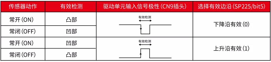 (1)主軸參數(shù)(SP225/bit5)中選擇接近開關信號的有效邊沿,信號選擇如下表所示,請根據(jù)實際選擇。