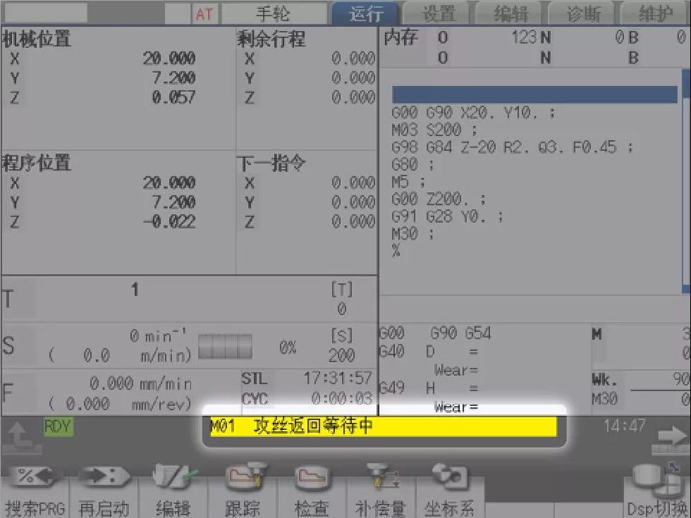 在攻絲循環(huán)中因突發(fā)狀況(急停、復(fù)位、機床斷電等)中斷,突發(fā)狀況解除后,移動軸時會出現(xiàn)“M01 攻絲返回等待中 0057”報警。