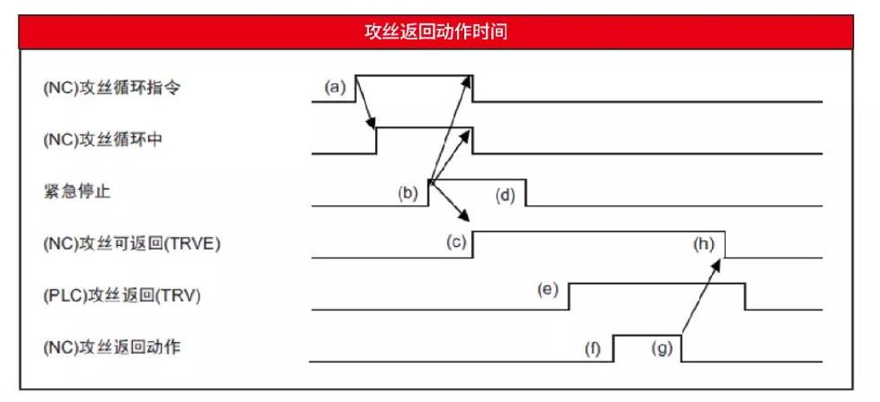 攻絲循環(huán)時因中斷接通可攻絲返回(TRVE) 信號的狀態(tài)下,接通攻絲返回(TRV) 信號,則可啟動攻絲返回動作。如下執(zhí)行攻絲返回: