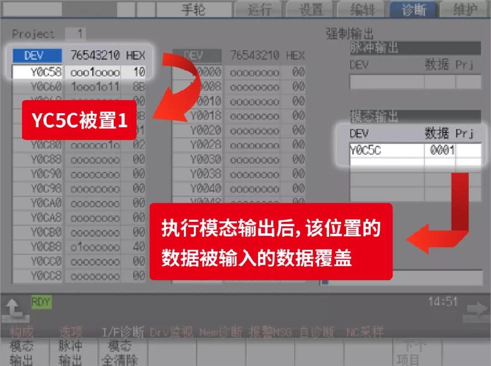 “M01 攻絲返回等待中 0057”報警發(fā)生后,需要執(zhí)行攻絲返回動作,即接通攻絲返回信號(TRV),使絲錐從工件中脫離。