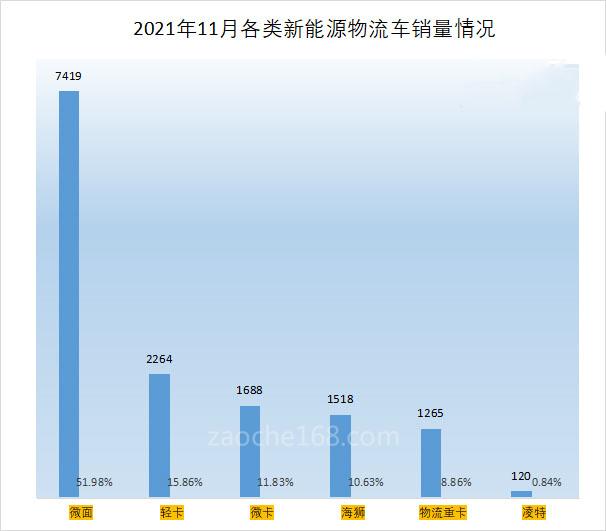 據(jù)數(shù)據(jù)顯示,2021年11月新能源物流車共銷售14274輛。其中,新能源微面車型最多,占比近6成,銷量為7419輛;新能源輕卡銷量約占11月總銷量的16%,其在短途城配以及生鮮冷鏈領(lǐng)域應(yīng)用廣泛,11月銷售2264輛;新能源微卡銷量為1688輛,市場占比為11.83%;新能源海獅銷量為1518輛,占比約為10.63%;物流重卡的銷量為1265輛,占比8.84%。