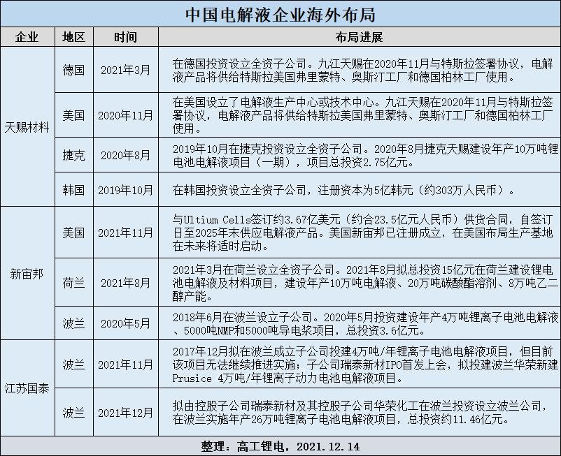 全球電動化加速,動力電池產(chǎn)業(yè)鏈導(dǎo)入本土化生產(chǎn)的需求迫切,帶動中國電解液企業(yè)集體出海。