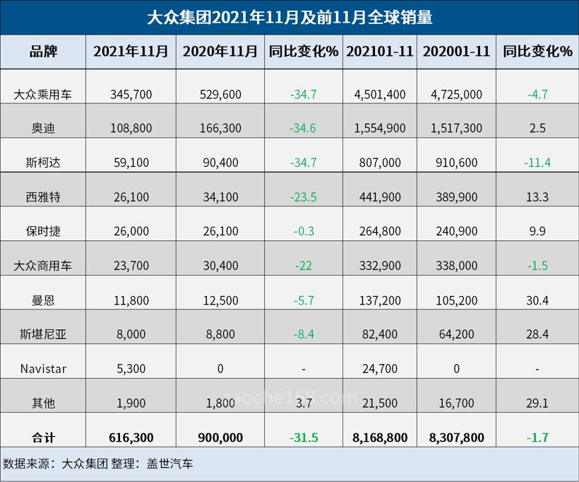 最近四個(gè)月,由于芯片短缺,大眾汽車的全球月度銷量均略高于60萬(wàn)輛,均較去年同期下降逾30%。其中,8月的銷量為61.65萬(wàn)輛,9月的銷量為62.62萬(wàn)輛,10月的銷量為60.09萬(wàn)輛,11月的銷量為61.63萬(wàn)輛。然而,此前七個(gè)月,除2月外,其余月份的銷量均保持在70萬(wàn)至90萬(wàn)輛。
