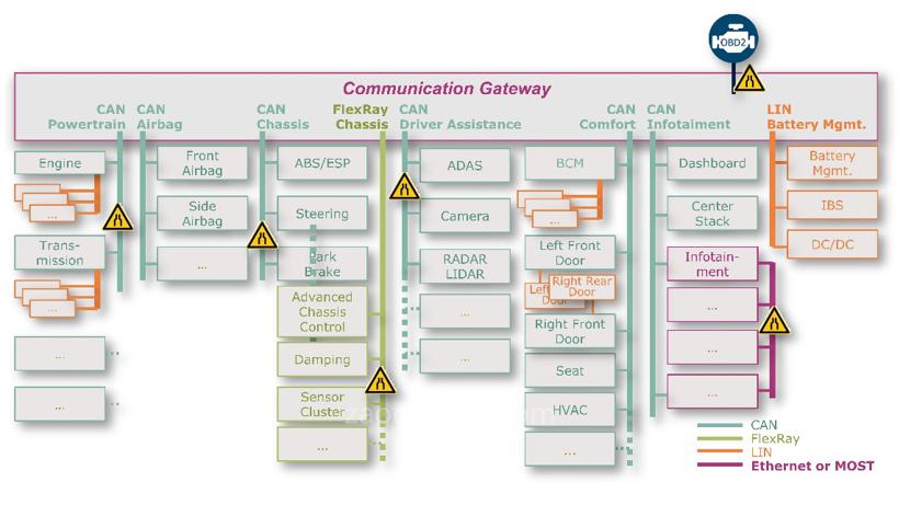 如今,習(xí)慣上將車輛劃分為多個功能域(如動力總成、安全、車身、信息娛樂、底盤、駕駛輔助等),這些功能域通常獨立運行,并通過獨立的總線系統(tǒng)相互聯(lián)網(wǎng)。對于這些域之間的數(shù)據(jù)交換,需要利用一些通常稱為網(wǎng)關(guān)的功能來完成。網(wǎng)關(guān)可以是一個獨立的ECU,也可以是功能單元的一個組成部分。圖1顯示這種架構(gòu)的一個示例。