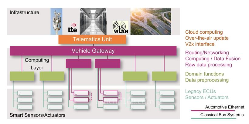 中央網(wǎng)關(guān)充當(dāng)域之間的接口以及用于連接外部世界的“連接網(wǎng)關(guān)”。另外,在計算層,圖中所示的域控制器也需要網(wǎng)關(guān)功能。