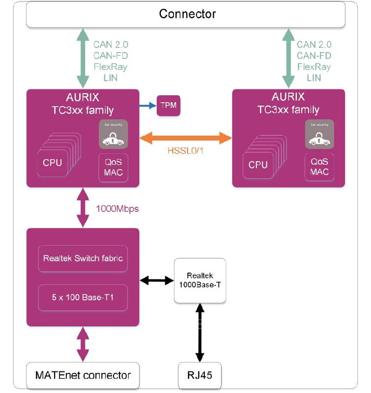憑借首個汽車網(wǎng)關(guān)平臺,英飛凌提供了一個開發(fā)平臺用于測試基于以太網(wǎng)的新型車輛系統(tǒng)。它具有一個可擴展的模塊化系統(tǒng),緊跟車輛通信當(dāng)前趨勢。來自Realtek的一臺汽車以太網(wǎng)交換機提供五個汽車用100Base-T1以太網(wǎng)端口。AURIX? TC397具有強大的多核架構(gòu),通過1Gb/s以太網(wǎng)接口連接到交換機,并支持多種協(xié)議:
