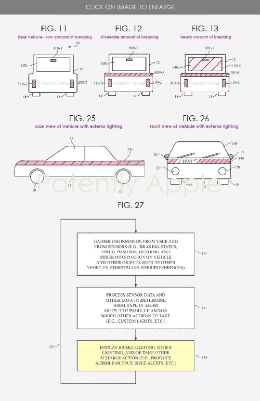 蘋(píng)果專利圖11-13,展示了一種更具交流性的方式,可在不同時(shí)間點(diǎn)傳遞車輛不同級(jí)別的剎車。圖25和26為帶有外部照明的說(shuō)明性車輛的側(cè)視圖,其中一個(gè)附加了文字;圖27為說(shuō)明性流程圖,演示了在產(chǎn)生基于光的警告和其他輸出的同時(shí)操作車輛和相關(guān)系統(tǒng)所涉及的步驟。