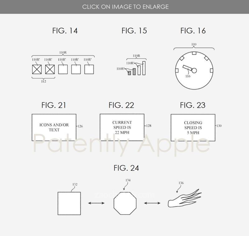圖21示例為車輛照明區(qū)域(如區(qū)域#126)如何顯示圖標(biāo)和/或文本。文本(例如,字母數(shù)字字符)可能包含靜態(tài)文本信息(例如,“停止”表示車輛正在駛停)或可能包含實(shí)時(shí)更新信息(例如,“當(dāng)前速度為22英里/小時(shí)”)。