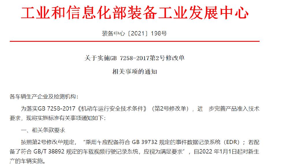 進入12月以來,EDR概念瞬間沖上汽車行業(yè)熱議話題榜,相關企業(yè)股價接連上漲。究其原因,主要跟此前公布的一項法規(guī)有關。今年4月,工業(yè)和信息化部裝備工業(yè)發(fā)展中心發(fā)布《關于實施 GB 7258-2017第 2號修改單相關事項的通知》,對《機動車運行安全技術條件》進行了補充,通知明確:從 2022 年1月1日起,國內(nèi)所有新生產(chǎn)的乘用車都強制要求配備 EDR,或配備符合規(guī)定的DVR。法規(guī)的強制實施,勢必會帶動相關產(chǎn)業(yè)鏈一段時間的繁榮,同時也意味著汽車產(chǎn)業(yè)又一個新的“賽道”即將開啟。