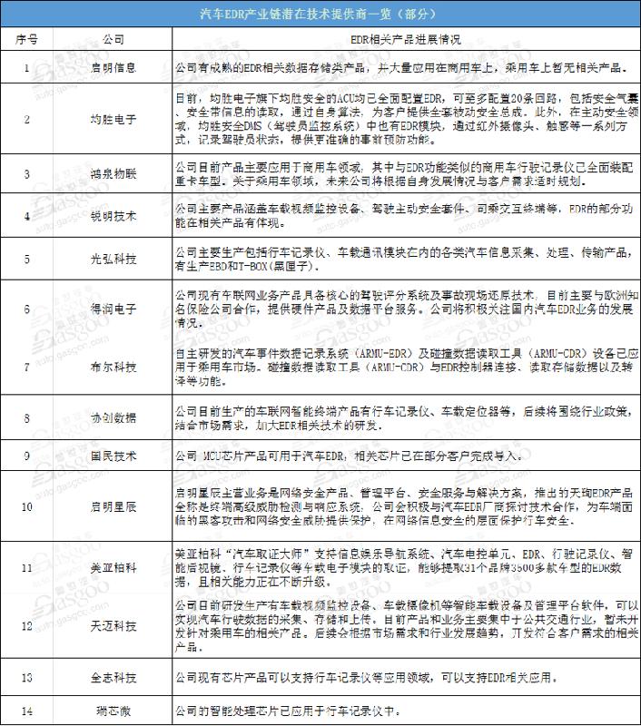 因此,EDR需求的快速提升將帶動產(chǎn)品集成商以及車規(guī)級MCU、存儲、電源、傳感器、汽車安全氣囊、數(shù)據(jù)提取等相關產(chǎn)業(yè)鏈公司的發(fā)展。不過,從目前來看,目前國內(nèi)廠商獨立供應乘用車 EDR 硬件產(chǎn)品的公司并不是很多,多數(shù)廠商在商用車EDR領域有布局,也有部分公司擁有相關技術能力但未量產(chǎn)相關產(chǎn)品。