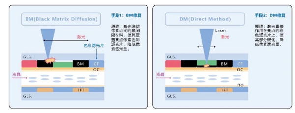 目前最常見的修復(fù)手段有兩種,都是通過激光降低亮點(diǎn)像素的透光量。分為BM修復(fù)和DM修復(fù)。BM修復(fù)是通過激光熱熔像素點(diǎn)之間,間隔的黑色材料,使其覆蓋在像素點(diǎn)上,以降低其透光量;DM修復(fù)是激光直接作用在像素點(diǎn)上,使其部分碳化,降低其透光量。
