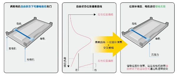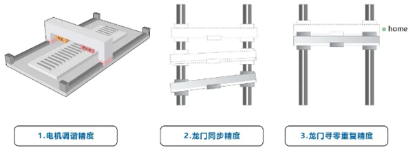 龍門機(jī)構(gòu)的運(yùn)動(dòng)精度,受到電機(jī)調(diào)諧的精度、龍門運(yùn)動(dòng)時(shí)的同步精度以及龍門尋零重復(fù)的精度等因素影響,可能造成最終動(dòng)作的精度不足。