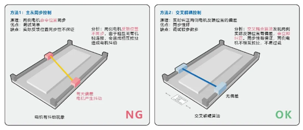 因此,我們采用交叉解耦控制,通過實(shí)時(shí)糾正兩側(cè)電機(jī)反饋位置的偏差,同步性有保證,兩側(cè)電機(jī)不相互拉扯,也不易過載。