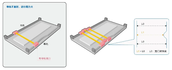 如果導(dǎo)軌筆直且平行,運(yùn)行暢通無阻;一旦存在彎曲,則會出現(xiàn)阻力。由于交叉解耦強(qiáng)制龍門機(jī)構(gòu)橫向通過,所以依然會造成電機(jī)抖動(dòng)。通常我們在現(xiàn)場所遇到的龍門機(jī)構(gòu),很難保證完全的筆直,因此仍然需通過控制方式的優(yōu)化來尋找突破口。