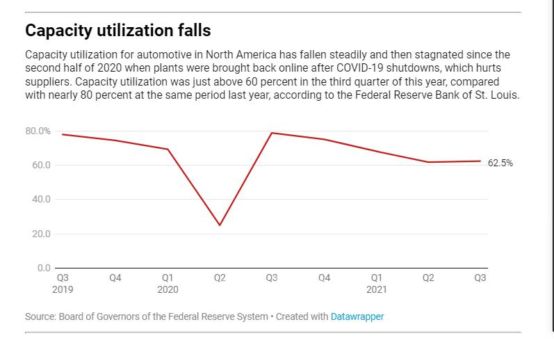 Brooks Wilkins Sharkey & Turco PLLC的聯(lián)合創(chuàng)始人丹·夏基(Dan Sharkey)說(shuō),“在供應(yīng)鏈的一端,你看到了這些瘋狂的、過(guò)高的增長(zhǎng)。在供應(yīng)鏈的另一端,整車廠收取更高的價(jià)格。夾在中間的是所有的供應(yīng)商?!?BR> 近年來(lái),北美地區(qū)輕型汽車的產(chǎn)能利用率一直在穩(wěn)步下降,并且,自2020年下半年新冠肺炎疫情導(dǎo)致工廠停產(chǎn)后又重新開工以來(lái),一直處于停滯狀態(tài)。根據(jù)圣路易斯聯(lián)邦儲(chǔ)備銀行(Federal Reserve Bank of St. Louis)的數(shù)據(jù),今年第三季產(chǎn)能利用率略高于60%,去年同期則為近80%。