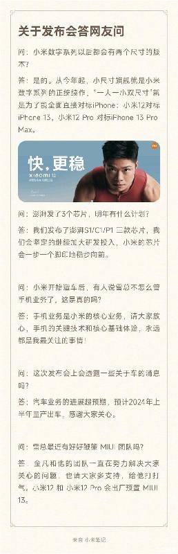 12月24日,在距離小米12發(fā)布僅剩4天時(shí)間之際,雷軍在微博上發(fā)布了一則《關(guān)于發(fā)布會(huì)答網(wǎng)友問》。其中關(guān)于汽車業(yè)務(wù)方面,雷軍再次表示,小米汽車業(yè)務(wù)的進(jìn)展超預(yù)期,預(yù)計(jì)2024年上半年量產(chǎn)出車。