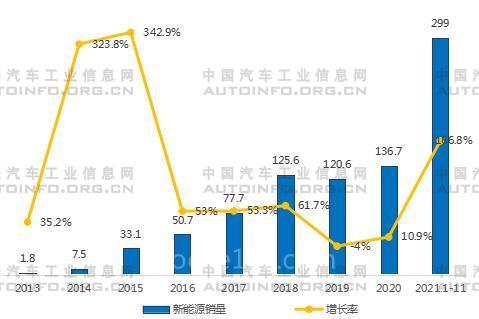 2020年-2021年11月中國新能源月度銷量(萬輛)
