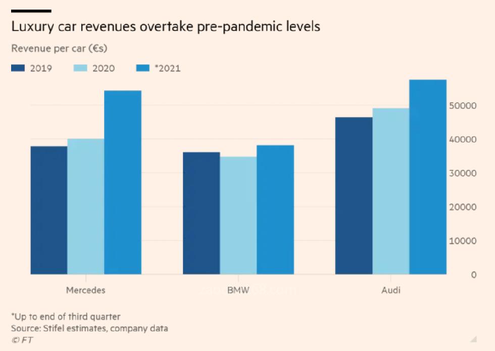 斯蒂費(fèi)爾銀行(Stifel bank)為英國《金融時(shí)報(bào)》進(jìn)行的分析顯示,與2019年疫情大流行前的水平相比,寶馬、奧迪和梅賽德斯-奔馳的每輛車收入平均增長了近25%。