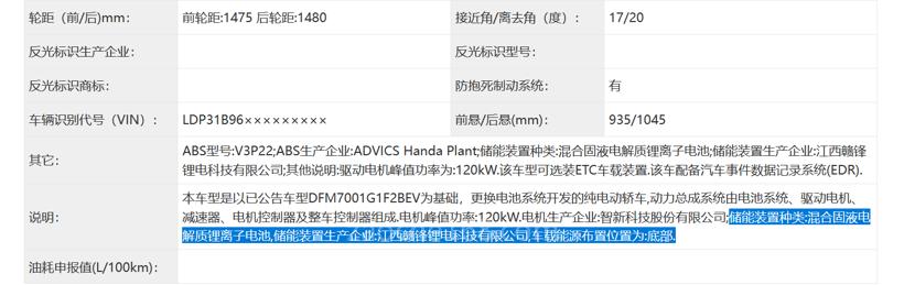 在工信部近期公示的《道路機(jī)動車輛生產(chǎn)企業(yè)及產(chǎn)品公告》(第351批)中,蓋世汽車關(guān)注到,混合固液電解質(zhì)鋰電首度配套亮相。公告信息顯示,東風(fēng)汽車申報(bào)的一款純電動轎車的儲能裝置種類是“混合固液電解質(zhì)鋰離子電池”,生產(chǎn)企業(yè)為“江西贛鋒鋰電科技有限公司”,系贛鋒鋰業(yè)全資子公司。