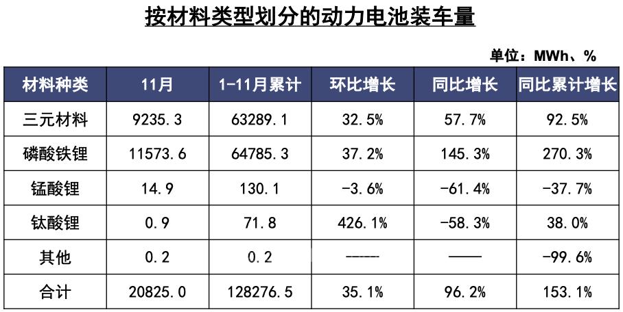 隨著新能源汽車突發(fā)猛進(jìn)地發(fā)展,磷酸鐵鋰電池的裝機(jī)量不斷提升,目前其裝機(jī)量已經(jīng)超過三元電池。根據(jù)充電聯(lián)盟數(shù)據(jù),截止到2021年11月我國動力電池裝機(jī)量累計128.5GWh,其中三元電池裝機(jī)量63.3GWh,磷酸鐵鋰電池裝機(jī)量64.8GWh。這是自今年5月份以來,磷酸鐵鋰電池的產(chǎn)量連續(xù)7個月超過三元電池。
