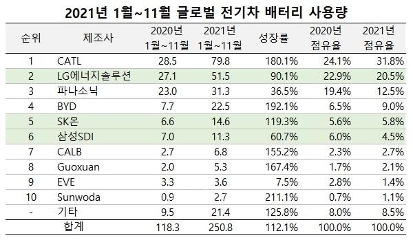 SNE Research指出,今年1-11月,中國(guó)企業(yè)引領(lǐng)了全球電動(dòng)汽車(chē)市場(chǎng)(包含純電、插電混動(dòng)和混合動(dòng)力汽車(chē))的增長(zhǎng)。僅寧德時(shí)代和比亞迪兩家,市場(chǎng)占有率就超過(guò)40%,且與去年同期相比增長(zhǎng)了180%、192%,在電動(dòng)汽車(chē)市場(chǎng)有著極高的地位。據(jù)該機(jī)構(gòu)分析,2021全年排名將和前11個(gè)月保持一致。