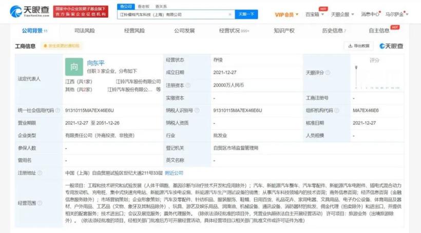 據(jù)天眼查顯示,12月27日,江鈴福特汽車科技(上海)有限公司成立,法定代表人向東平,注冊(cè)資本2億人民幣。股東信息顯示,該公司由江鈴汽車股份有限公司、Ford Motor Company共同持股,持股比例分別為51%、49%。