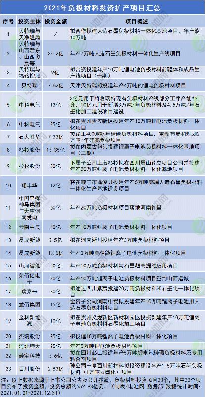在負極材料領(lǐng)域,電池網(wǎng)統(tǒng)計在內(nèi)的23個項目中,22個項目公布了投資金額,投資總額約552.93億元。