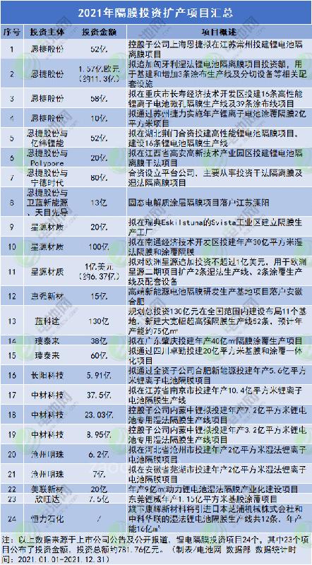 在隔膜領(lǐng)域,電池網(wǎng)統(tǒng)計在內(nèi)的24個項目中,23個項目公布了投資金額,投資總額約781.76億元。